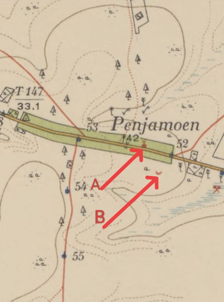 Masjid Al Mubarok yang dalam peta tersebut ditandai dengan warna merah berarti dibuat menggunakan batu berada di sisi Utara jalan raya menuju Sungailiat ( Niet verharde weg, in alle moesson ).