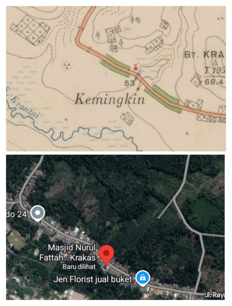 Menelisik keberadaan masjid tersebut dengan Google map, masjid berada di sebelah selatan jalan raya. Artinya ada perbedaan lokasi dengan peta tahun 1931.
