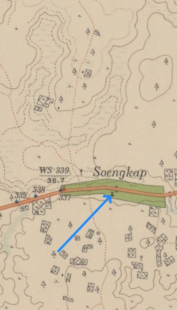 Masjid ditandai dengan warna hitam yang berarti masih terbuat dari kayu berada di sisi selatan jalan raya Namang Celuak (Verharde weg waarvan de verharding 2-4 m breed is).